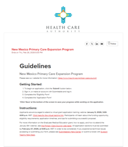 The New Mexico Health Care Authority (HCA) will award $1 million in grant funding to establish or expand residency programs and support primary care workforce beginning July 1, 2026. Award amounts will depend upon the number of applications received, overall funding, and availability of funds.